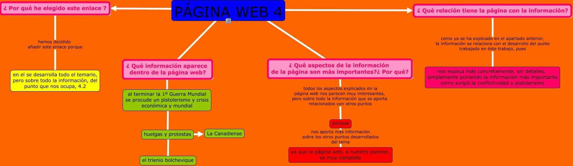 Este Cmap, tiene información relacionada con: COMENTARIO PAGINA WEB 4, PÁGINA WEB 4 ???? ¿ Por qué he elegido este enlace ?, ¿ Qué información aparece dentro de la página web? ???? al terminar la 1º Guerra Mundial se procude un pistolerismo y crisis económica y mundial, ¿ Por qué he elegido este enlace ? hemos decidido añadir este enlace porque en el se desarrolla todo el temario, pero sobre todo la información, del punto que nos ocupa, 4.2, PÁGINA WEB 4 ???? ¿ Qué relación tiene la página con la información?, ¿ Qué aspectos de la información de la página son más importantes?¿ Por qué? todos los aspectos explicados en la página web nos parecen muy interesantes, pero sobre todo la información que se aporta relacionados con otros puntos porque, huelgas y protestas ???? La Canadiense, PÁGINA WEB 4 ???? ¿ Qué información aparece dentro de la página web?, huelgas y protestas ???? el trienio bolchevique, al terminar la 1º Guerra Mundial se procude un pistolerismo y crisis económica y mundial ???? huelgas y protestas, ¿ Qué relación tiene la página con la información? como ya se ha explicado en el apartado anterior, la información se relaciona con el desarrollo del punto trabajado en éste trabajo, pues nos explica más concretamente, sin detalles, simplemente poniendo la información más importante como surgió la conflictividad y pistolerismo, porque nos aporta más información sobre los otros puntos desarrollados del tema ya que la página web, a nuestro parecer, es muy completa, PÁGINA WEB 4 ???? ¿ Qué aspectos de la información de la página son más importantes?¿ Por qué?