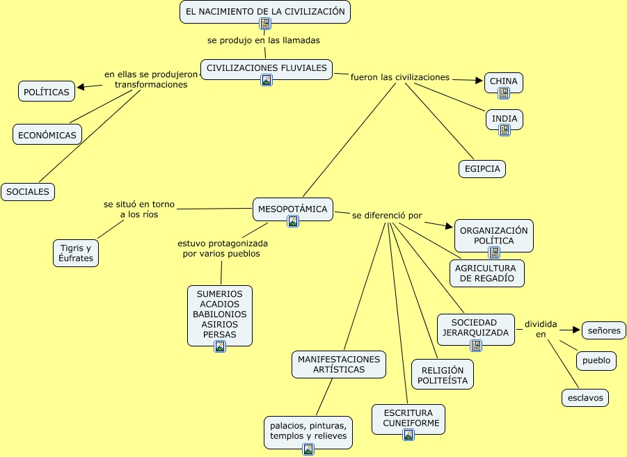 Este Cmap, tiene información relacionada con: MESOPOTAMIA, MESOPOTÁMICA se diferenció por SOCIEDAD JERARQUIZADA, MESOPOTÁMICA estuvo protagonizada por varios pueblos SUMERIOS ACADIOS BABILONIOS ASIRIOS PERSAS, CIVILIZACIONES FLUVIALES fueron las civilizaciones EGIPCIA, MANIFESTACIONES ARTÍSTICAS ???? palacios, pinturas, templos y relieves, MESOPOTÁMICA se diferenció por RELIGIÓN POLITEÍSTA, CIVILIZACIONES FLUVIALES en ellas se produjeron transformaciones POLÍTICAS, MESOPOTÁMICA se diferenció por ORGANIZACIÓN POLÍTICA, CIVILIZACIONES FLUVIALES fueron las civilizaciones INDIA, MESOPOTÁMICA se diferenció por ESCRITURA CUNEIFORME, CIVILIZACIONES FLUVIALES en ellas se produjeron transformaciones SOCIALES, SOCIEDAD JERARQUIZADA dividida en señores, EL NACIMIENTO DE LA CIVILIZACIÓN se produjo en las llamadas CIVILIZACIONES FLUVIALES, MESOPOTÁMICA se situó en torno a los ríos Tigris y Éufrates, MESOPOTÁMICA se diferenció por AGRICULTURA DE REGADÍO, CIVILIZACIONES FLUVIALES fueron las civilizaciones MESOPOTÁMICA, SOCIEDAD JERARQUIZADA dividida en esclavos, CIVILIZACIONES FLUVIALES fueron las civilizaciones CHINA, CIVILIZACIONES FLUVIALES en ellas se produjeron transformaciones ECONÓMICAS, SOCIEDAD JERARQUIZADA dividida en pueblo, MESOPOTÁMICA se diferenció por MANIFESTACIONES ARTÍSTICAS
