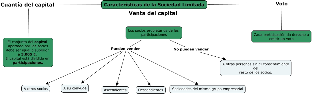 Este Cmap, tiene información relacionada con: Sociedad Limitada, Los socios propietarios de las participaciones Pueden vender Sociedades del mismo grupo empresarial, Características de la Sociedad Limitada Voto Cada participación da derecho a emitir un voto, Los socios propietarios de las participaciones Pueden vender A otros socios, Características de la Sociedad Limitada Venta del capital Los socios propietarios de las participaciones, Características de la Sociedad Limitada Cuantía del capital El conjunto del capital aportado por los socios debe ser igual o superior a 3.005 E. El capital está dividido en participaciones., Los socios propietarios de las participaciones Pueden vender Ascendientes, Los socios propietarios de las participaciones Pueden vender A su cónyuge, Los socios propietarios de las participaciones Pueden vender Descendientes, Los socios propietarios de las participaciones No pueden vender A otras personas sin el consentimiento del resto de los socios.