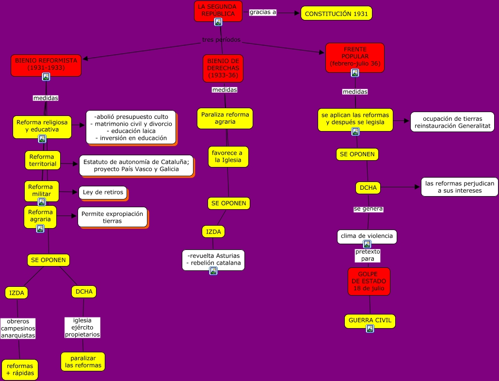 Este Cmap, tiene información relacionada con: SEGUNDA REPÚBLICA, FRENTE POPULAR (febrero-julio 36) medidas SE OPONEN, IZDA obreros campesinos anarquistas reformas + rápidas, DCHA ???? las reformas perjudican a sus intereses, BIENIO REFORMISTA (1931-1933) medidas Reforma religiosa y educativa, BIENIO REFORMISTA (1931-1933) medidas Reforma territorial, LA SEGUNDA REPÚBLICA gracias a CONSTITUCIÓN 1931, FRENTE POPULAR (febrero-julio 36) medidas se aplican las reformas y después se legisla, LA SEGUNDA REPÚBLICA tres períodos FRENTE POPULAR (febrero-julio 36), Reforma agraria ???? Permite expropiación tierras, BIENIO REFORMISTA (1931-1933) medidas Reforma agraria, SE OPONEN ???? IZDA, BIENIO REFORMISTA (1931-1933) ???? SE OPONEN, SE OPONEN ???? DCHA, Reforma territorial ???? Estatuto de autonomía de Cataluña; proyecto País Vasco y Galicia, SE OPONEN IZD IZDA, BIENIO DE DERECHAS (1933-36) medidas Paraliza reforma agraria, BIENIO DE DERECHAS (1933-36) medidas favorece a la Iglesia, BIENIO DE DERECHAS (1933-36) medidas SE OPONEN, clima de violencia pretexto para GOLPE DE ESTADO 18 de julio, Reforma militar ???? Ley de retiros