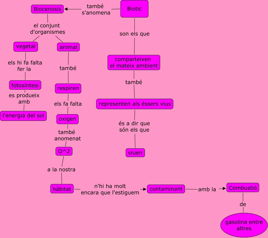 Este Cmap, tiene información relacionada con: facto biotic, comparteixen el mateix ambient també representen als éssers vius, Biotic son els que comparteixen el mateix ambient, oxigen també anomenat O^2, Biocenosis el conjunt d'organismes animal, respiren els fa falta oxigen, animal també respiren, Biocenosis el conjunt d'organismes vegetal, Biotic també s'anomena Biocenosis, contaminant amb la Combustió, O^2 a la nostra hàbitat, hàbitat n'hi ha molt encara que l'estiguem contaminant, vegetal els hi fa falta fer la fotosíntesi, fotosíntesi es produeix amb l'energia del sol, representen als éssers vius és a dir que són els que viuen, Combustió de gasolina entre altres