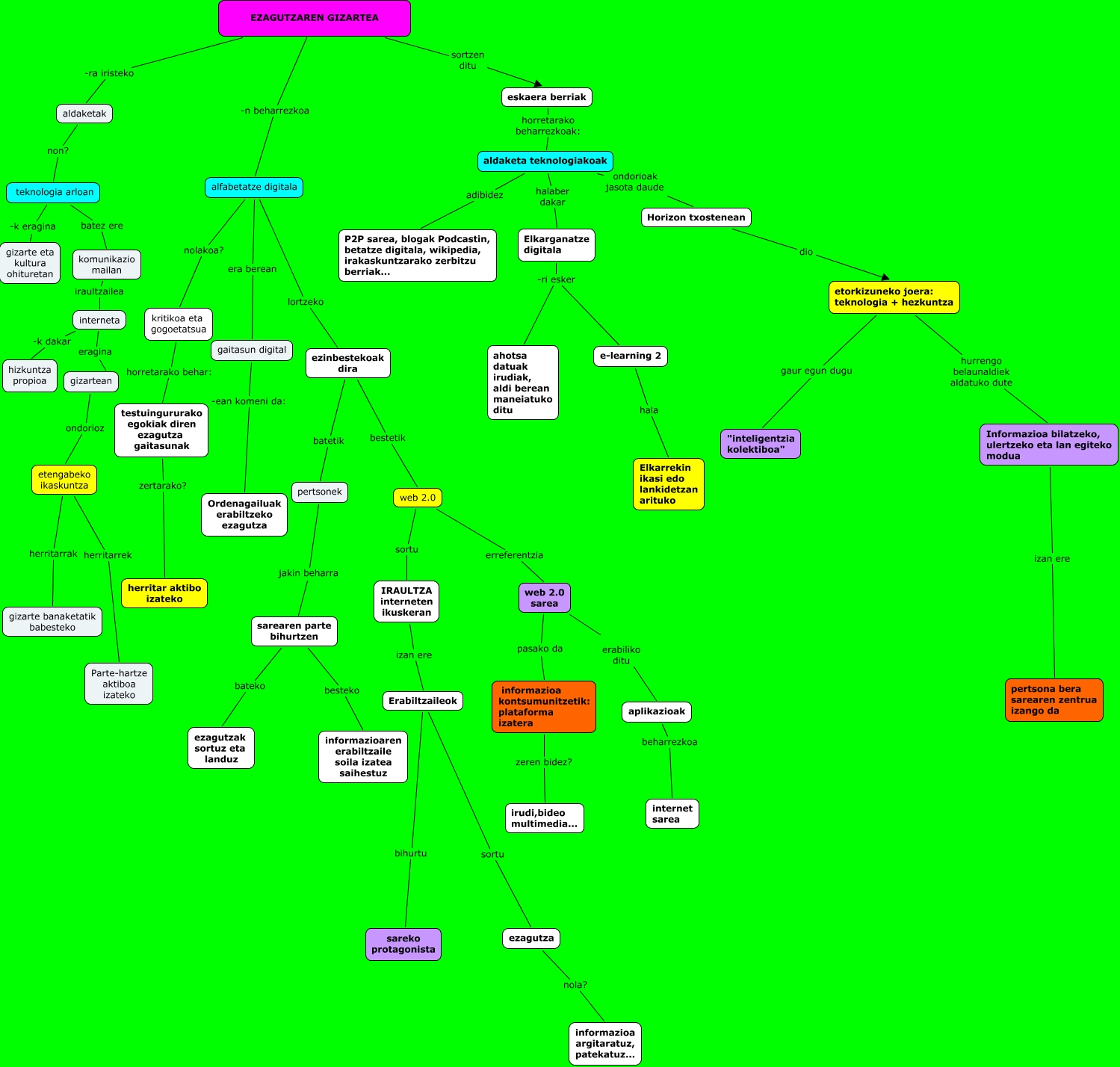 Este Cmap, tiene información relacionada con: mapa kontzeptuala1, sarearen parte bihurtzen bateko ezagutzak sortuz eta landuz, teknologia arloan batez ere komunikazio mailan, gizartean ondorioz etengabeko ikaskuntza, ezinbestekoak dira batetik pertsonek, ezagutza nola? informazioa argitaratuz, patekatuz..., web 2.0 erreferentzia web 2.0 sarea, aldaketak non? teknologia arloan, Informazioa bilatzeko, ulertzeko eta lan egiteko modua izan ere pertsona bera sarearen zentrua izango da, aldaketa teknologiakoak adibidez P2P sarea, blogak Podcastin, betatze digitala, wikipedia, irakaskuntzarako zerbitzu berriak..., Erabiltzaileok bihurtu sareko protagonista, EZAGUTZAREN GIZARTEA sortzen ditu eskaera berriak, e-learning 2 hala Elkarrekin ikasi edo lankidetzan arituko, web 2.0 sarea pasako da informazioa kontsumunitzetik: plataforma izatera, etorkizuneko joera: teknologia + hezkuntza gaur egun dugu "inteligentzia kolektiboa", aldaketa teknologiakoak ondorioak jasota daude Horizon txostenean, teknologia arloan -k eragina gizarte eta kultura ohituretan, alfabetatze digitala era berean gaitasun digital, EZAGUTZAREN GIZARTEA -n beharrezkoa alfabetatze digitala, alfabetatze digitala nolakoa? kritikoa eta gogoetatsua, sarearen parte bihurtzen besteko informazioaren erabiltzaile soila izatea saihestuz