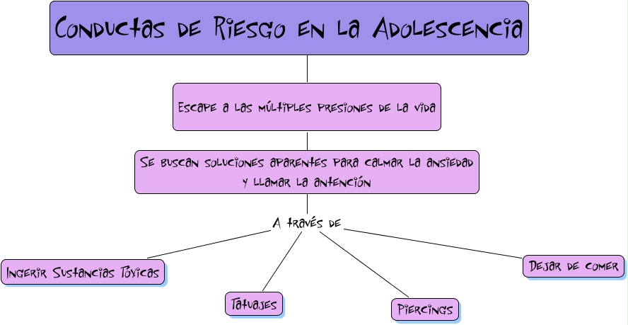 Este Cmap, tiene información relacionada con: conductas de riesgo en la adolescencia, Escape a las múltiples presiones de la vida A través de Dejar de comer, Escape a las múltiples presiones de la vida A través de Tatuajes, Escape a las múltiples presiones de la vida A través de Ingerir Sustancias Tóxicas, Escape a las múltiples presiones de la vida A través de Piercings, Escape a las múltiples presiones de la vida A través de Se buscan soluciones aparentes para calmar la ansiedad y llamar la antención, Conductas de Riesgo en la Adolescencia ???? Escape a las múltiples presiones de la vida