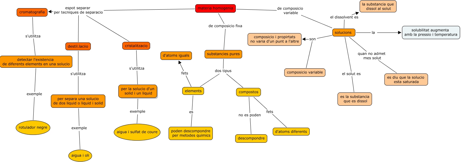Este Cmap, tiene información relacionada con: materia homogenia, substancies pures dos tipus compostos, per la solucio d'un solid i un liquid exemple aigua i sulfat de coure, materia homogenia de composicio fixa substancies pures, solucions el solut es es la substancia que es dissol, solucions el dissolvent es la substancia que dissol al solut, elements fets d'atoms iguals, detectar l'existencia de diferents elements en una solucio exemple rotulador negre, per separa una solucio de dos liquid o liquid i solid exemple aigua i oli, cristalitzacio s'utilitza per la solucio d'un solid i un liquid, solucions la solubilitat augmenta amb la pressio i temperatura, elements es poden descompondre per metodes quimics, solucions quan no admet mes solut es diu que la solucio esta saturada, compostos fets d'atoms diferents, substancies pures dos tipus elements, cromatografia s'utilitza detectar l'existencia de diferents elements en una solucio, materia homogenia espot separar per tecniques de separacio cristalitzacio, materia homogenia de composicio variable solucions, materia homogenia espot separar per tecniques de separacio cromatografia, solucions son composicio i propirtats no varia d'un punt a l'altre, compostos no es poden descompondre
