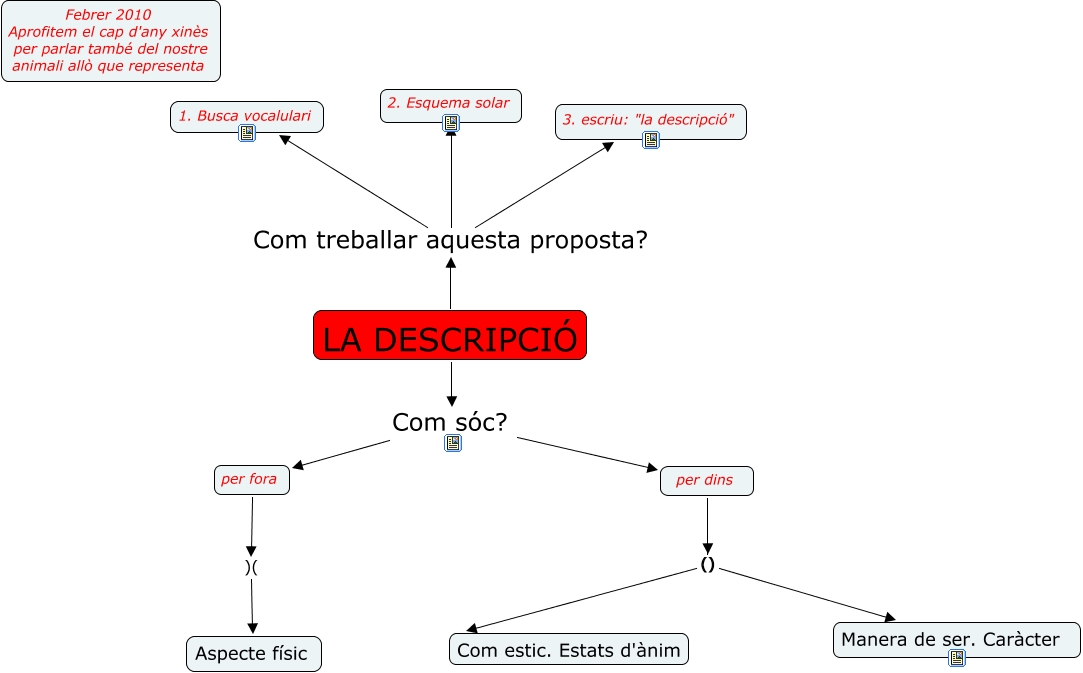 Aquest mapa conceptual conté informació relacionada amb: Com sóc, per fora )( Aspecte físic, per dins () Manera de ser. Caràcter, LA DESCRIPCIÓ Com sóc? per dins, LA DESCRIPCIÓ Com treballar aquesta proposta? 1. Busca vocalulari, per dins () Com estic. Estats d'ànim, LA DESCRIPCIÓ Com sóc? per fora, LA DESCRIPCIÓ Com treballar aquesta proposta? 2. Esquema solar, LA DESCRIPCIÓ Com treballar aquesta proposta? 3. escriu: "la descripció"