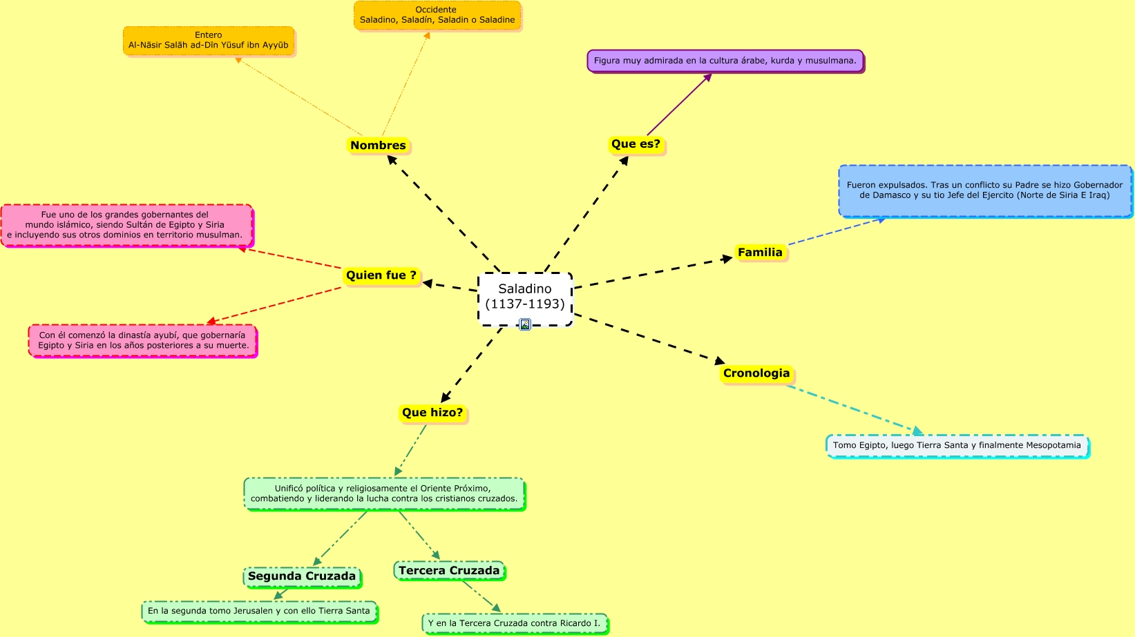 Este Cmap, tiene información relacionada con: Saladino, Saladino (1137-1193) Que es? Figura muy admirada en la cultura árabe, kurda y musulmana., Saladino (1137-1193) Familia Fueron expulsados. Tras un conflicto su Padre se hizo Gobernador de Damasco y su tio Jefe del Ejercito (Norte de Siria E Iraq), Saladino (1137-1193) Nombres Entero Al-Nāsir Salāh ad-Dīn Yūsuf ibn Ayyūb, Unificó política y religiosamente el Oriente Próximo, combatiendo y liderando la lucha contra los cristianos cruzados. Tercera Cruzada Y en la Tercera Cruzada contra Ricardo I., Saladino (1137-1193) Nombres Occidente Saladino, Saladín, Saladin o Saladine, Unificó política y religiosamente el Oriente Próximo, combatiendo y liderando la lucha contra los cristianos cruzados. Segunda Cruzada En la segunda tomo Jerusalen y con ello Tierra Santa, Saladino (1137-1193) Cronologia Tomo Egipto, luego Tierra Santa y finalmente Mesopotamia, Saladino (1137-1193) Que hizo? Unificó política y religiosamente el Oriente Próximo, combatiendo y liderando la lucha contra los cristianos cruzados., Saladino (1137-1193) Quien fue ? Fue uno de los grandes gobernantes del mundo islámico, siendo Sultán de Egipto y Siria e incluyendo sus otros dominios en territorio musulman., Saladino (1137-1193) Quien fue ? Con él comenzó la dinastía ayubí, que gobernaría Egipto y Siria en los años posteriores a su muerte.
