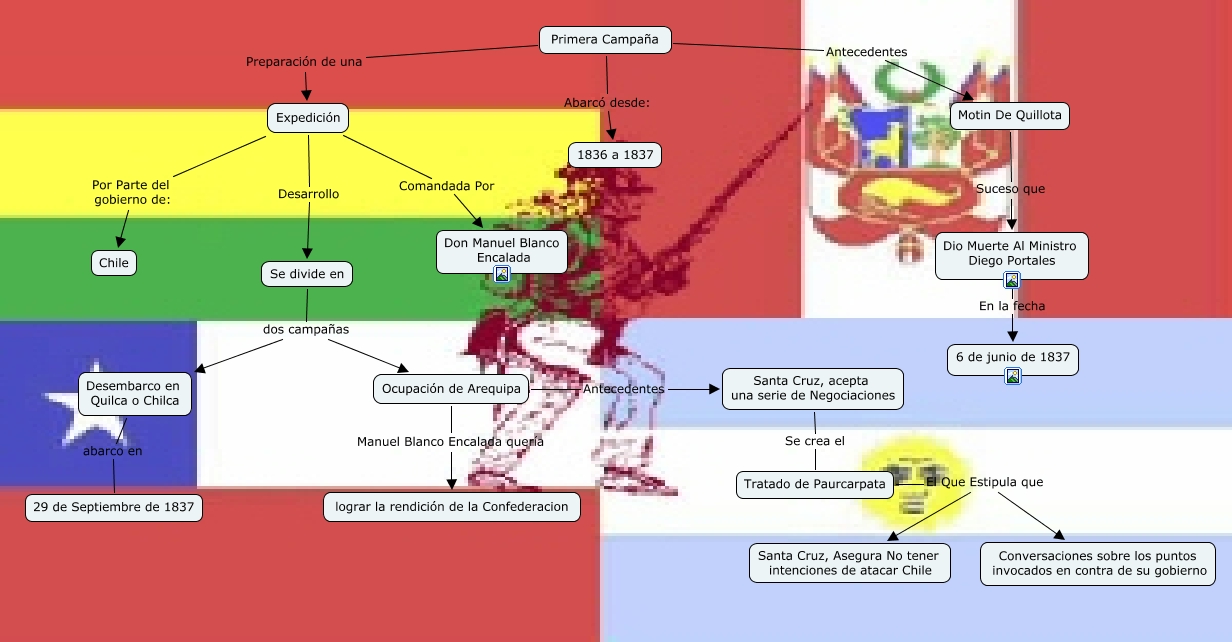 Este Cmap, tiene información relacionada con: Primera Campaña, Primera Campaña Preparación de una Expedición, Expedición Comandada Por Don Manuel Blanco Encalada, Expedición Desarrollo Se divide en, Santa Cruz, acepta una serie de Negociaciones Se crea el Tratado de Paurcarpata, Dio Muerte Al Ministro Diego Portales En la fecha 6 de junio de 1837, Desembarco en Quilca o Chilca abarco en 29 de Septiembre de 1837, Tratado de Paurcarpata El Que Estipula que Santa Cruz, Asegura No tener intenciones de atacar Chile, Se divide en dos campañas Desembarco en Quilca o Chilca, Expedición Por Parte del gobierno de: Chile, Primera Campaña Antecedentes Motin De Quillota, Primera Campaña Abarcó desde: 1836 a 1837, Ocupación de Arequipa Antecedentes Santa Cruz, acepta una serie de Negociaciones, Motin De Quillota Suceso que Dio Muerte Al Ministro Diego Portales, Se divide en dos campañas Ocupación de Arequipa, Tratado de Paurcarpata El Que Estipula que Conversaciones sobre los puntos invocados en contra de su gobierno, Ocupación de Arequipa Manuel Blanco Encalada quería lograr la rendición de la Confederacion