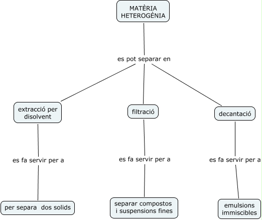 Este Cmap, tiene información relacionada con: Matèria Heterogènia, MATÈRIA HETEROGÈNIA es pot separar en extracció per disolvent, MATÈRIA HETEROGÈNIA es pot separar en filtració, decantació es fa servir per a emulsions immiscibles, MATÈRIA HETEROGÈNIA es pot separar en decantació, filtració es fa servir per a separar compostos i suspensions fines, extracció per disolvent es fa servir per a per separa dos solids